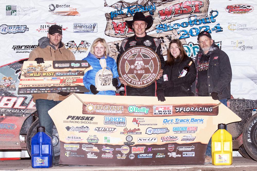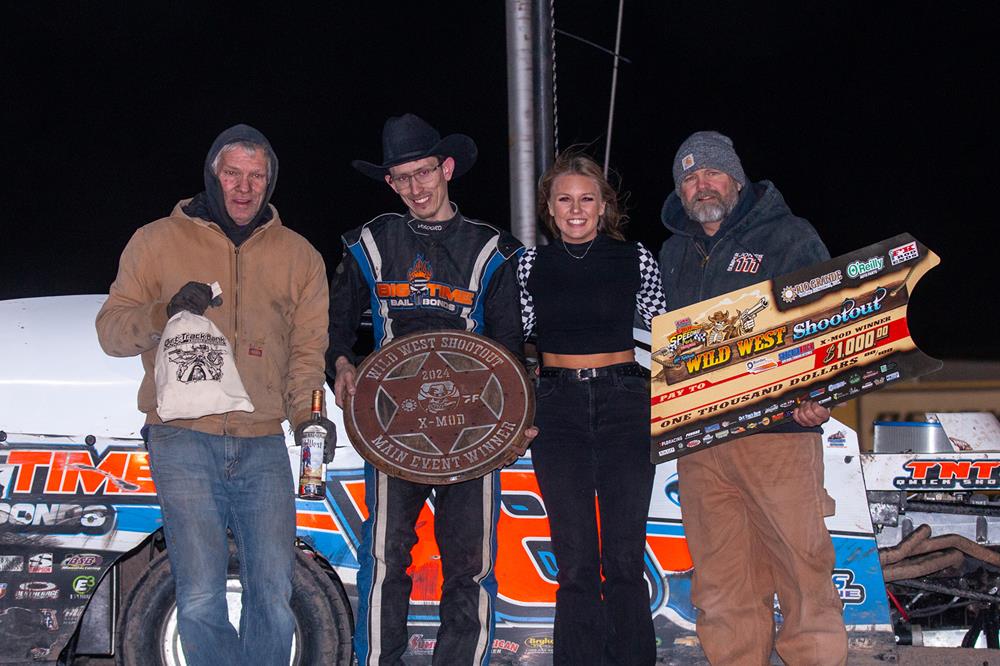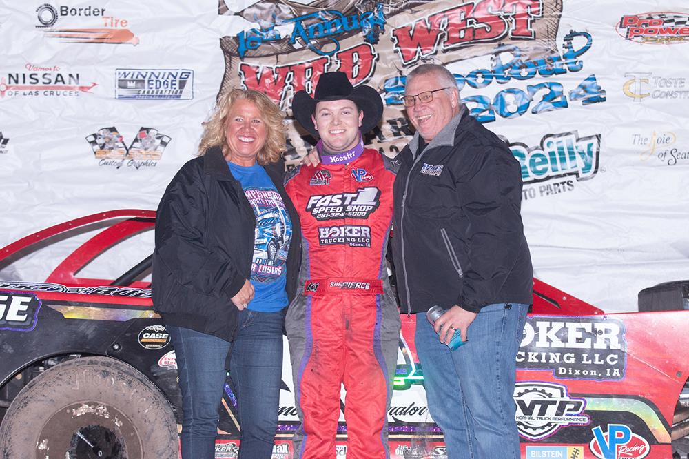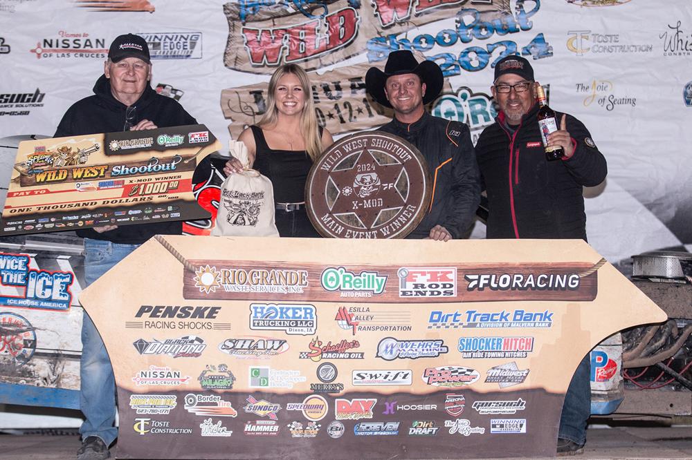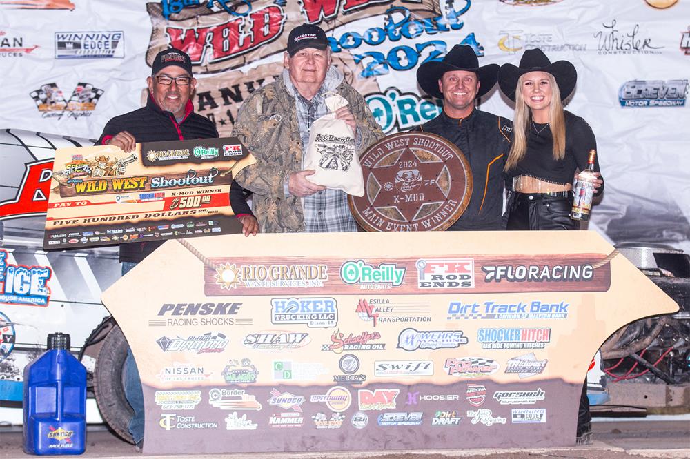 Jeff and Penny Hoker join Bobby Pierce in Victory Lane at the 2024 Wild West Shootout. (Tyler Rinken image)