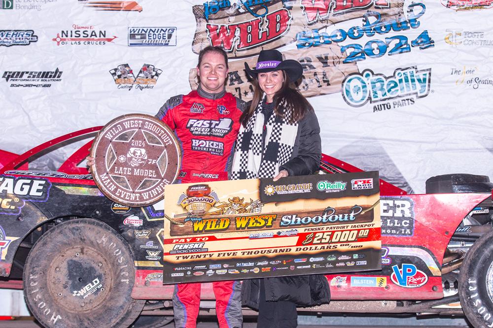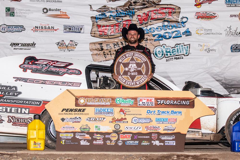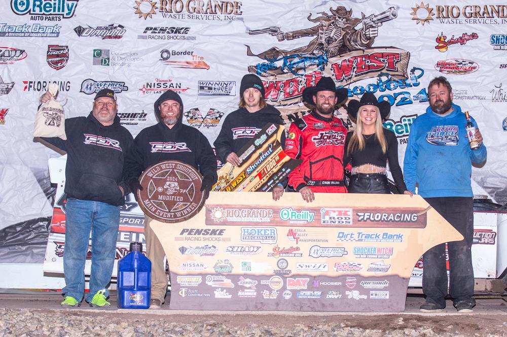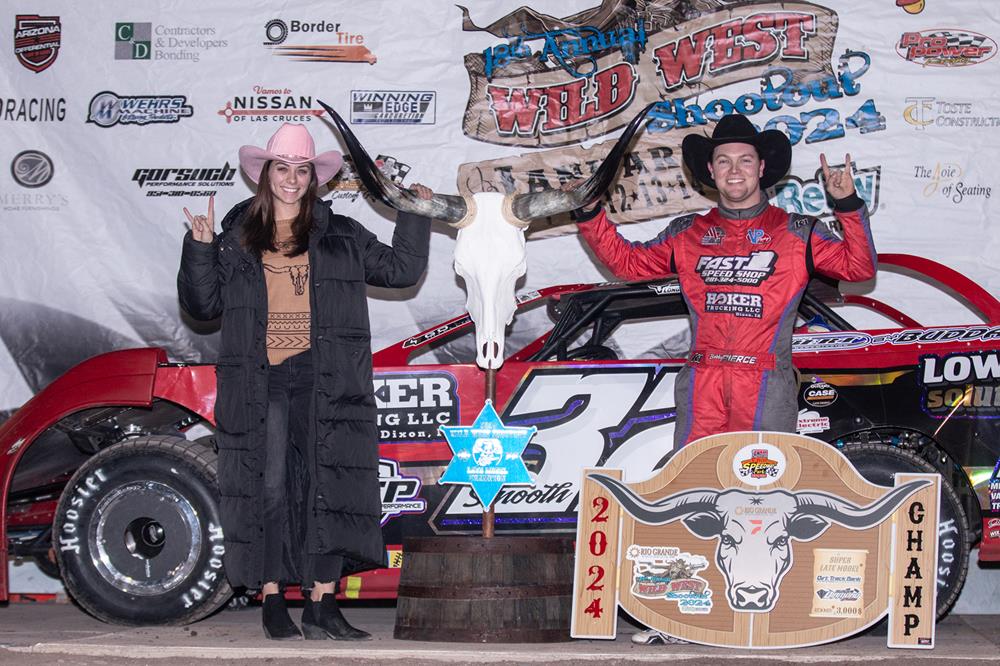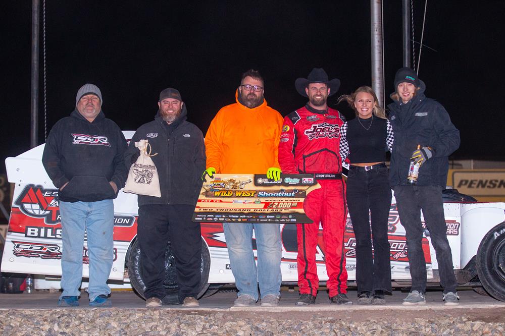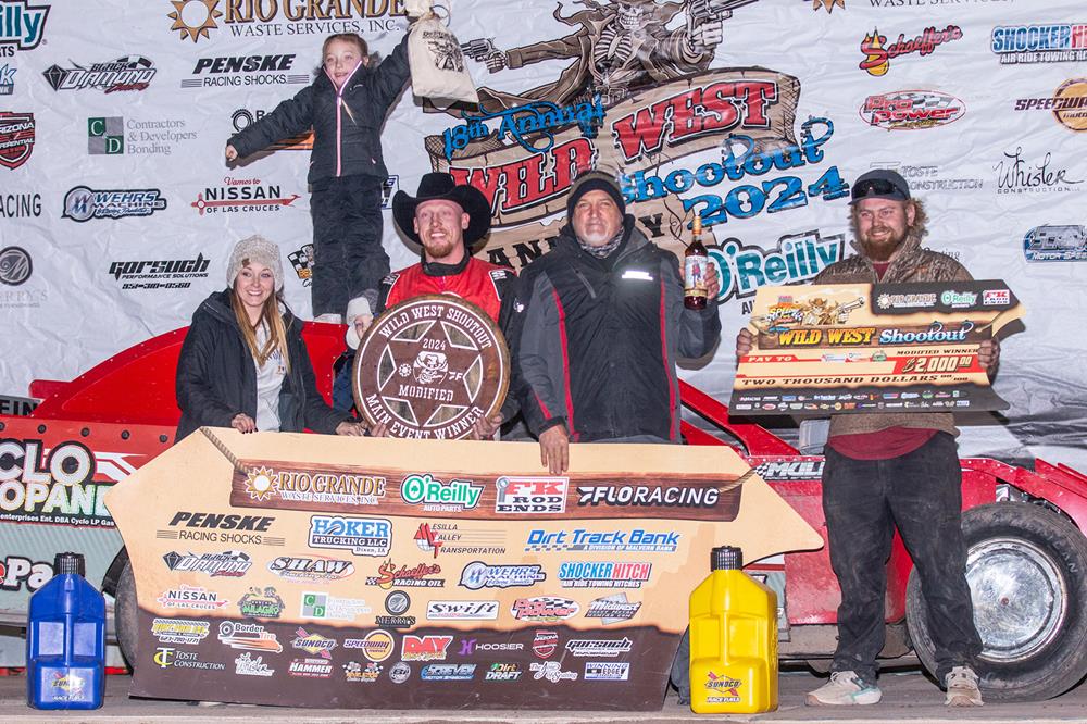 Jeff and Penny Hoker join Bobby Pierce in Victory Lane at the 2024 Wild West Shootout. (Tyler Rinken image)